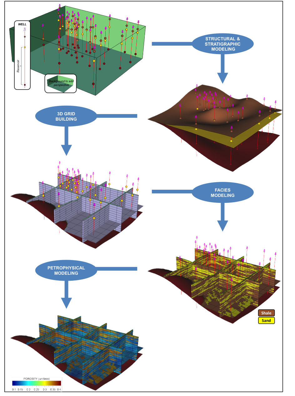 The core of any reservoir modeling workflow includes five steps: gathering the data, structural and stratigraphic modeling, three-dimensional (3D) grid building, facies modeling and petrophysical modeling (Figure 1). This chapter gives an overview of each step and some ideas on how the team’s members contribute to such work, either in providing input data or in defining what the model is needed for. The team members’ contributions will be detailed starting with the third chapter.