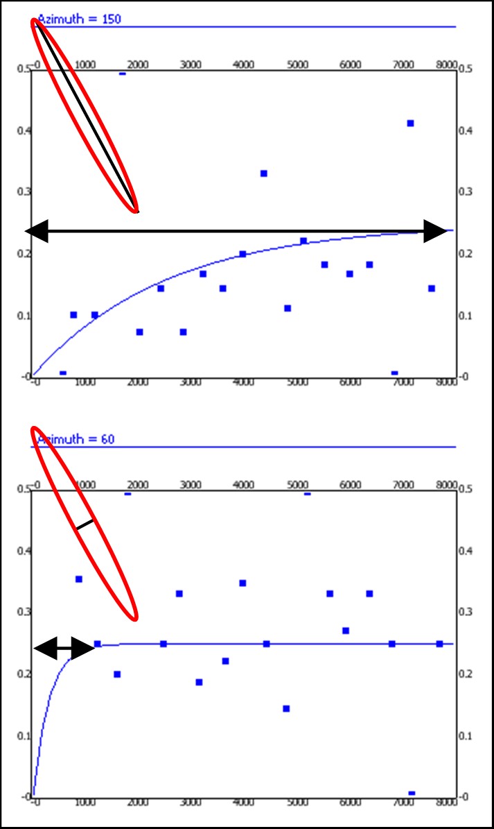 Then, kriging is done using a variogram model matching the experimental variogram (Figure 1B). One might argue that the plateau for the azimuth 150 is lower than the plateau at azimuth 60. In a real study, this would be investigated further. The resulting model (Figure 4) is closer to what we expected. The sand geobodies are more continuous along the azimuth 150 than in the first model. As our variogram is fitting to the experimental points, we could stop here.