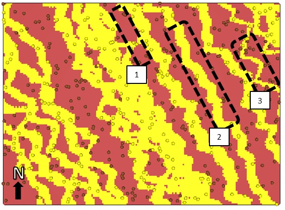 The geologist insisted though that he expected the channels to be even more continuous than they are now. He asked us to see if we could find a way to make it happen. After some testing, we decided to run kriging with a highly anisotropic variogram (Figure 1C). Of course, this variogram no longer matches the experimental variogram in the azimuth 150 - our new range is much too large. The kriging results pleased the geologist though (Figure 5) as the channels are now much better defined than before, as can be seen in the rectangle area labelled 2 noted in Figure 2, Figure 3, Figure 4 and Figure 5. In the meantime though, we start creating channel geobodies where none should exist (rectangle labelled 1, same pictures). Also, we still can’t get some channels right (rectangle labelled 3, same pictures). This channel was not sampled well enough by our wells for kriging to be able to track it.
