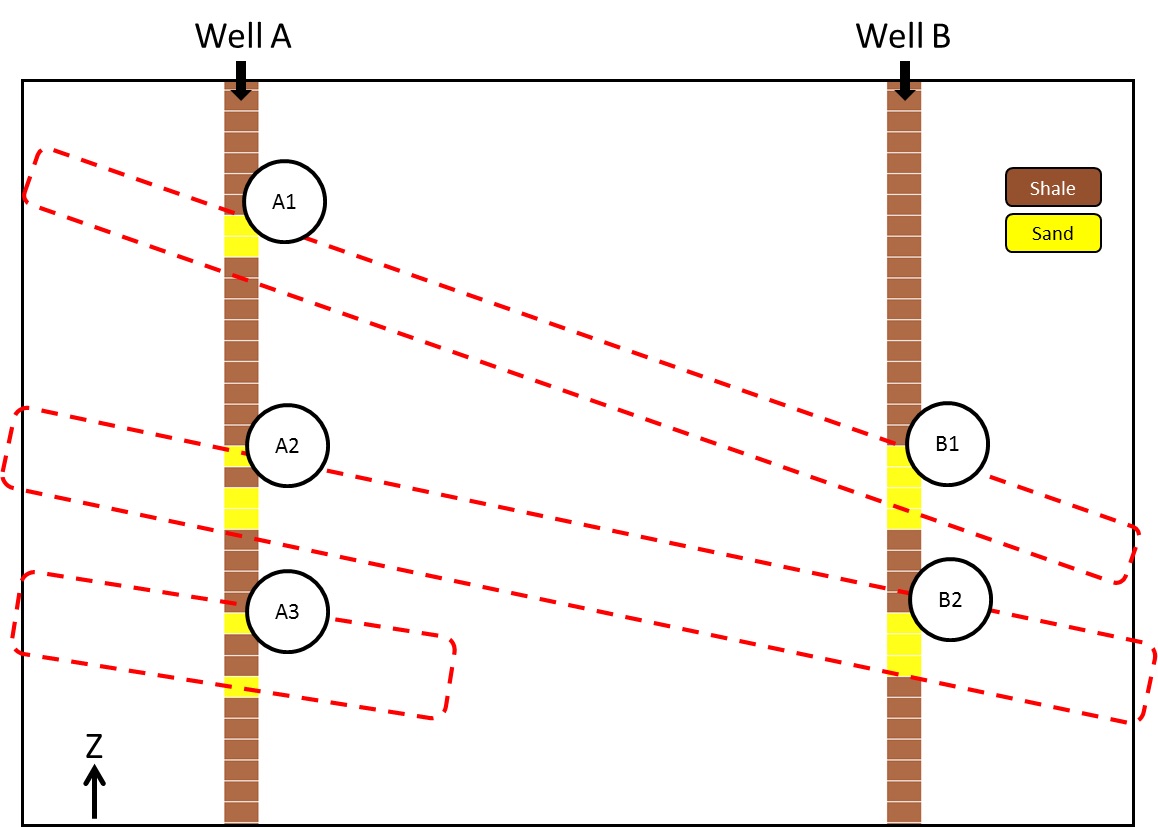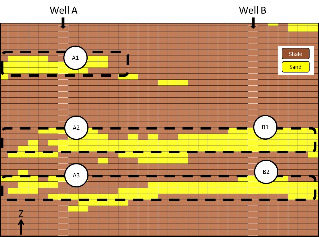 Figure 1 shows two wells A and B in cross-section, again in a sand-shale reservoir. They are part of a complete 3D dataset. The geologist decided to correlate the sand A1 of well A with the sand B1 of well B, as well as the sand A2 and B2. The sand A3 is not correlated to any sand in well B. From there, the geologist created a thickness map for the upper sand (A1-B1) as well as a thickness map for the lower sand (A2-B2) and the team starts making plans on how to develop this field. In parallel, a reservoir model was created to be fed to flow simulation (Figure 2). The two wells A and B were used in the 3D modeling, but not the geological interpretation itself due to limited communications between the geologist and the modeler: the team assumed that the model would necessarily match the geologist’s interpretation, so minimal time was spend on this. The result is drastically different from what the geologist had in mind though: in the geomodel, the sand A1 is not connected to well B, while we have two massive sands A2-B1 and A3-B2. If the model was to be sent as is to flow simulation, the team would now have two different representations of their reservoir: the one expressed in the early sand thickness maps created by the geologist and now the 3D model.