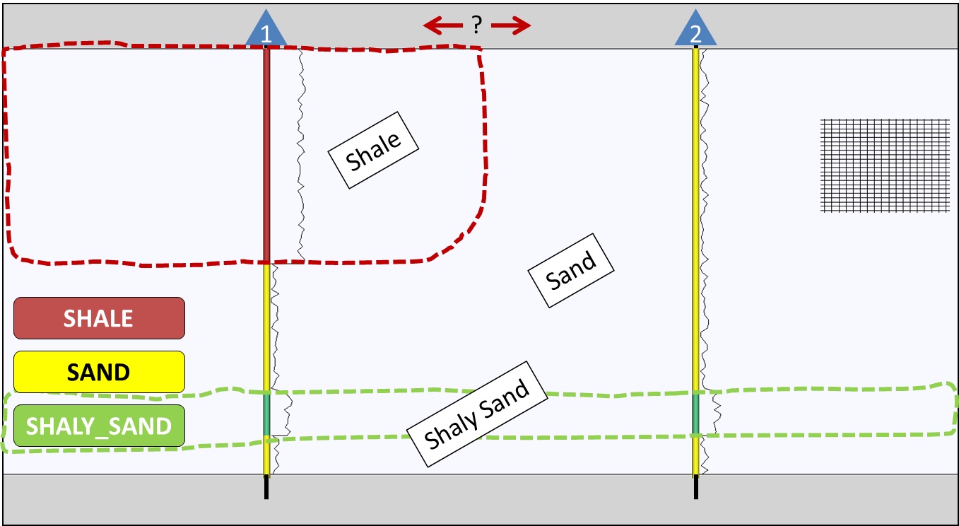 Let’s consider two wells with facies and VSH information (Figure 1). Well 1 shows 50m of Shale at the top followed by 30m of Sand, 20m of Shaly Sand and at last 10m of Sand. Well 2 is Sand all along except for 20m of Shaly Sand near the base of the reservoir. The Shaly Sand is interpreted as a continuous facies zone across the area while the Shale is believed to be of limited lateral extent. No data can tell where the Shale exactly stops between the two wells though. Each facies shows a specific range of VSH: the Sand is associated to VSH less than 30%, the Shaly Sand has VSH between 30% and 70% and the Shale is associated to VSH superior to 70%. We need to model the VSH and the facies in 3D while respecting our interpretation of the reservoir. Ideally, we need to be able to create multiple models showing different lateral extent of the Shale between the two wells. For an initial path, we would like a Shale ending approximately half-way between the two wells. To do the modeling, we have a 3D grid refined enough to capture these three facies’ spatial distribution.