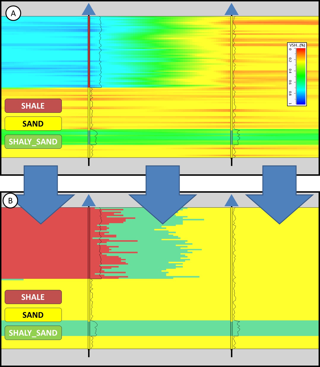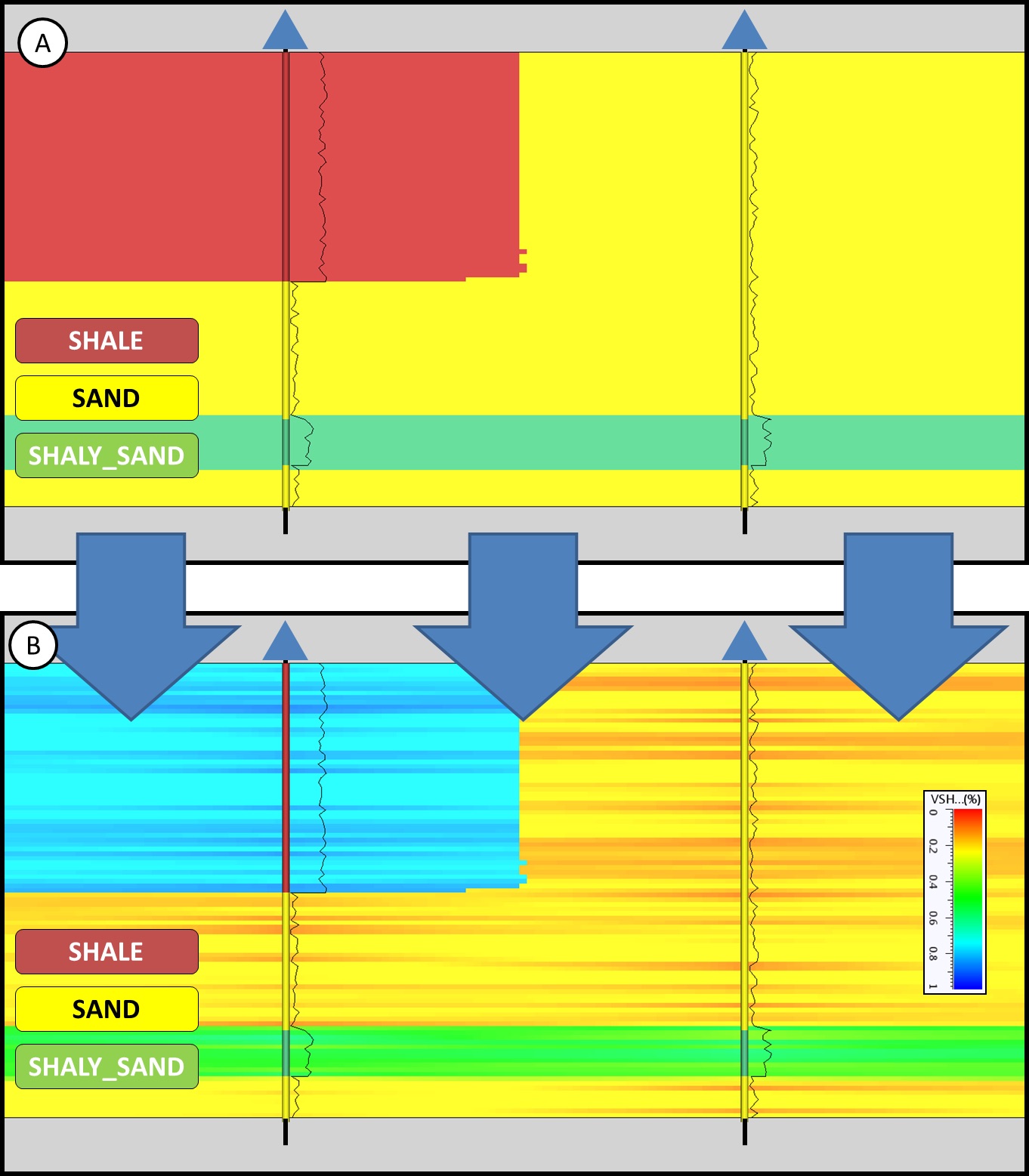 VSH is a continuous property which can takes a continuous range of values between 0% and 100%. All interpolators of continuous properties (as far as we know) create by definition models which vary continuously across the 3D grid. In the upper part of the unit, VSH will necessarily change progressively from 80% in average in the Shale on well 1, to 70%, 60%, 50%, 40% and 30% to finish around 20% in average in the Sand of well 2. It is unavoidable. When facies are calculated based on the cut-offs, it creates this halo of Shaly-Sand not observed at the wells. If the well data were showing that Shale and Sand are never in direct contact but instead are always separated by a zone of Shaly Sand, and VSH smoothly transition from high values to low values, then seeing Shaly Sand and a smooth VSH transition between the wells would be reasonable. But that is not what the wells are showing. Well 1 shows that VSH changes without transition between high and low values (limit Shale/Sand), but also between low and average values (limit Sand/Shaly Sand). The smooth VSH model (Figure 2) and the forced succession Shale – Shaly Sand – Sand are not backed up by the well data.