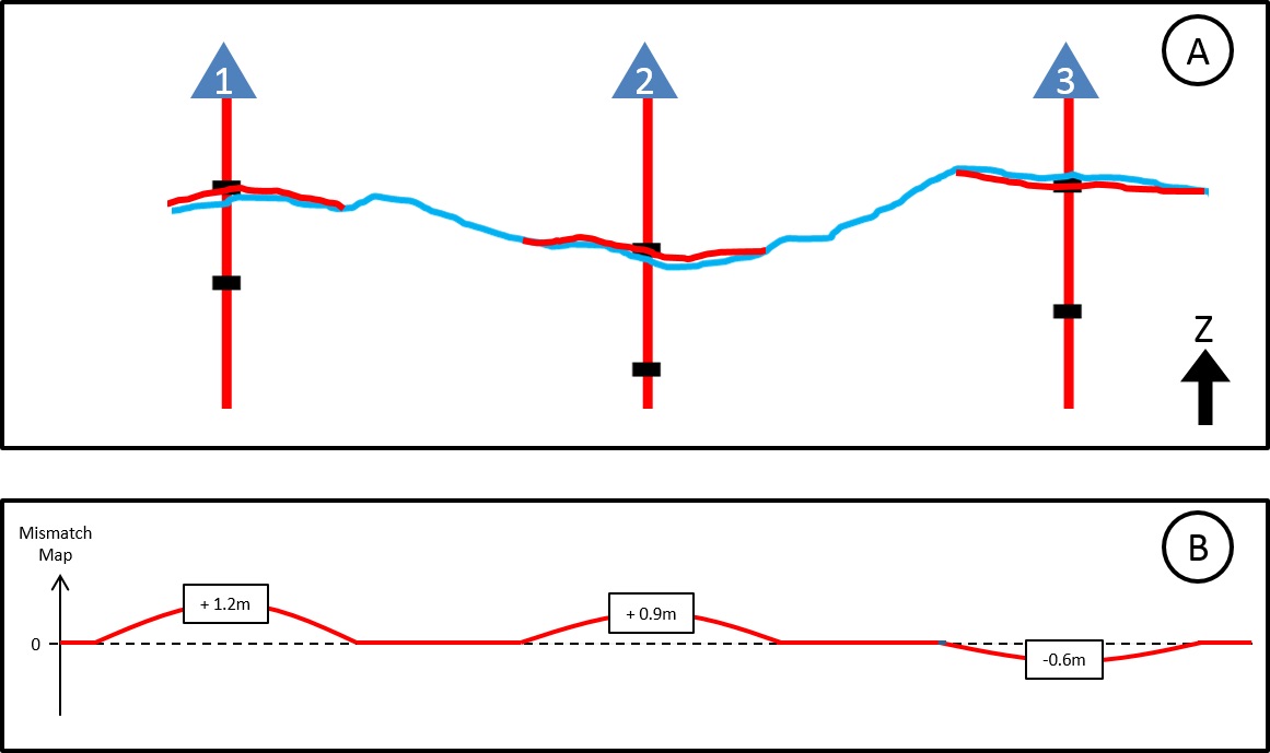 In Figure 1A, a seismic interpretation (blue line) has been depth-converted using the three wells 1, 2 and 3. The interpreted horizon is close to the well markers but a mismatch remains. Should it be corrected? A general rule in geomodeling is that if well data and seismic data are partly in contradiction, the well data shall be respected in priority because well data are more precise than seismic data. In the process of adjusting to the well, we try to respect the seismic data as much as possible. Naturally, if well and seismic data are in complete contradiction, it is wiser to understand ‘why’ instead of enforcing this rule blindly. Once the source of the inconsistency is identified, the team might agree that the data can be corrected to make them coherent one with the other, or the team might decide that the inconsistency is the result of different interpretations (for example). In that case, several geomodels might be needed, one for each interpretation. For the purposes of this section, we assume that it makes sense for our dataset to modify the seismic horizon to fit to the well markers.