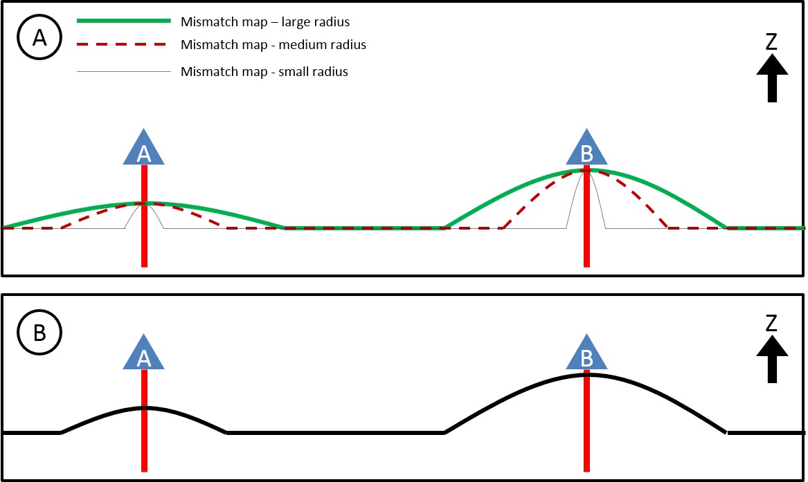 As illustrated in Figure 2, the challenge is to decide what radius to use around each well. In this example, the mismatch at well A is half of the mismatch at well B. If we use a very small radius for both wells (Figure 2A, black thin line), the adjustment zone is really narrow and the corrected horizon surfaces might show an obvious bullseye around each well. Using a medium-size radius (Figure 2A, red dashed line), the bullseye effect might be less noticeable, and so acceptable, around well A, while it might still be too visible around well B. At last, using a large radius (Figure 2A, green thick line), the bullseye effect might now be minimal on both wells, but the question might become that we are altering a too large portion of the seismic maps around each well.
