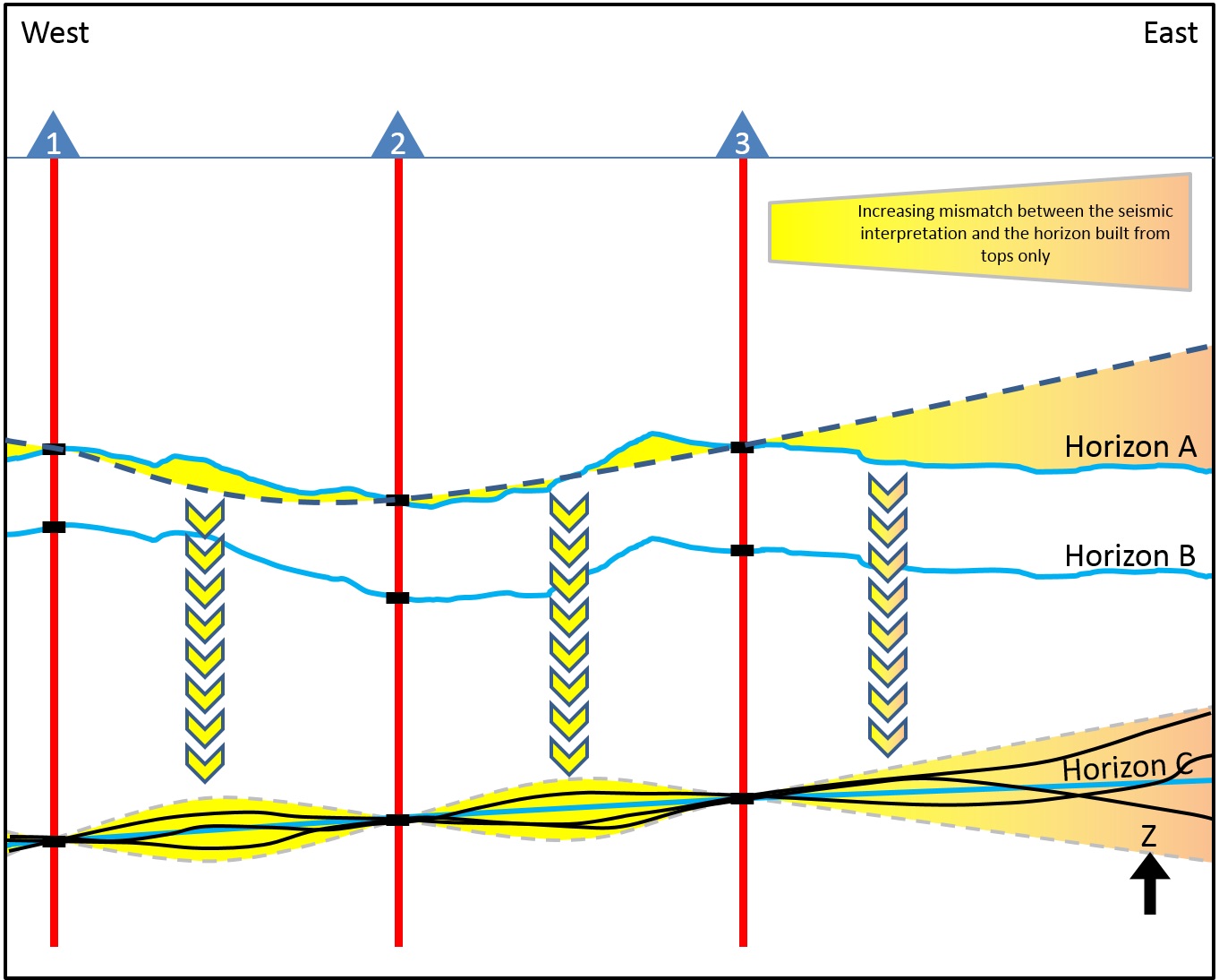 Other horizons known only from well markers are simply not conformable to any horizon picked on seismic. Such horizons can only be modeled from the well markers. No seismic horizon, such as Horizon A, can be used as a reference. In Figure 3, this is the case of Horizon C.