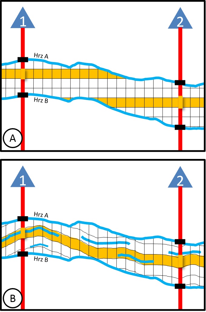 In many reservoirs the horizons, or a subset of them, might be conformable, one with the other. If one of these conformable horizons has been picked on seismic, then it can be used as a reference to model the other horizons. In Figure 3, Horizon B is interpreted as conformable with Horizon A. We can use the geometry of the Horizon A to model the geometry of Horizon B. A thickness map of the unit between Horizon A and Horizon B is interpolated from the thickness at each well (using geostatistical algorithms). Then, the geometry of Horizon B is calculated by subtracting the thickness map to the depth map of Horizon A. This is a first additional way to take advantage of a seismic interpretation. Sometimes, none of the seismic events they can interpret correspond to any of the stratigraphic markers interpreted by the geologists on the wells. These events are linked to other change of log signatures along the wells. When this happens, it is recommended to treat such horizon as we did here with Horizon A, and then create horizons for the real stratigraphic tops (= the horizons we do need for the 3D-grid) following the approach proposed here for Horizon B.