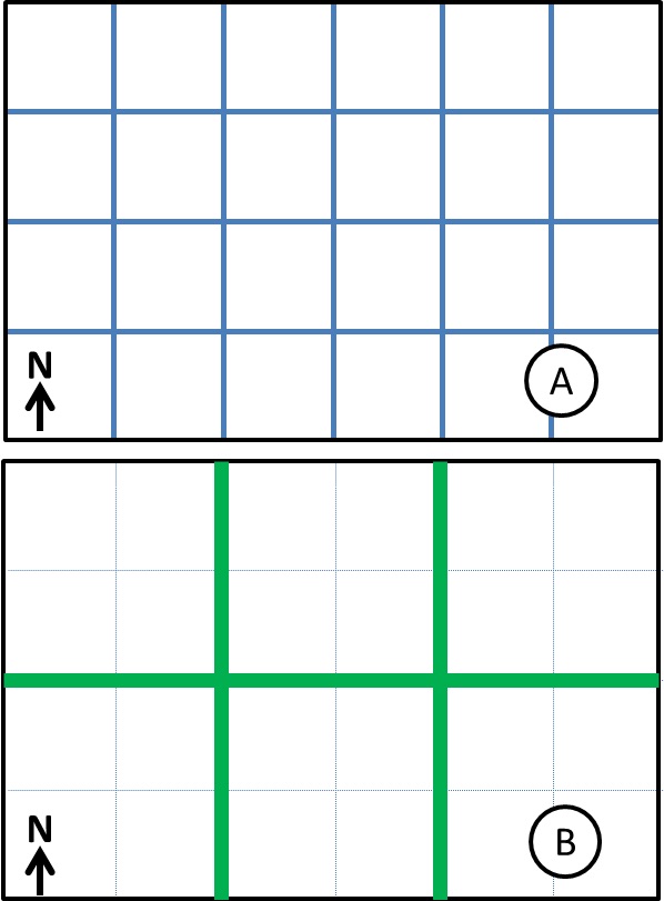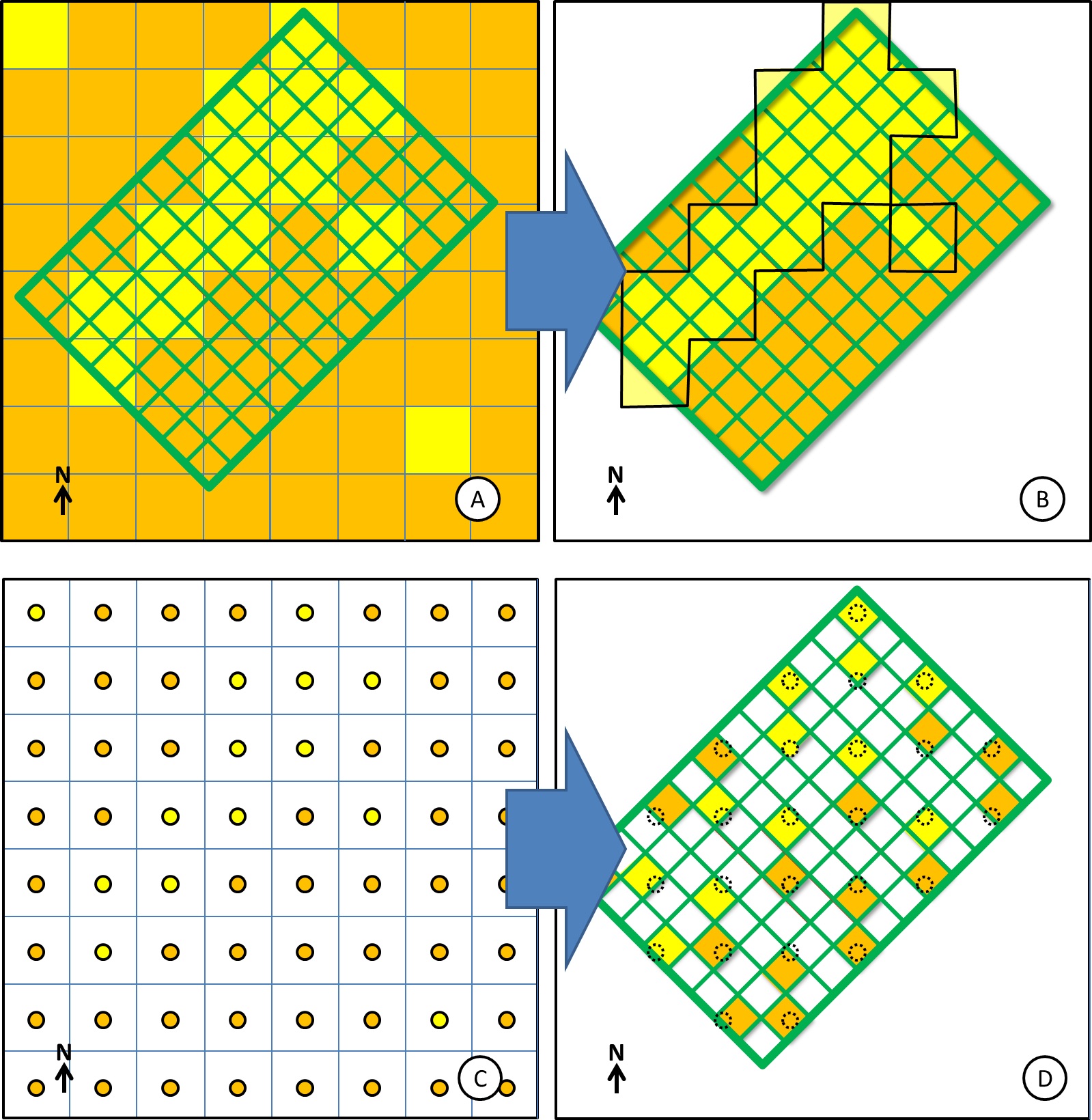 The first approach is probably the main one used in the industry and it is a very straightforward one. All the small cells of the simulation grid, which fall inside a large cell from the geological grid, are getting the value stored in that large cell. For example, with a sand-shale facies model (Figure 6A), the cells of the rotated flow simulation grid are assigned the facies sand if their center is falling in a sand cell of the original geological grid (Figure 6B, all the cells falling inside the black shape, delimiting the sand zone of the geological grid).