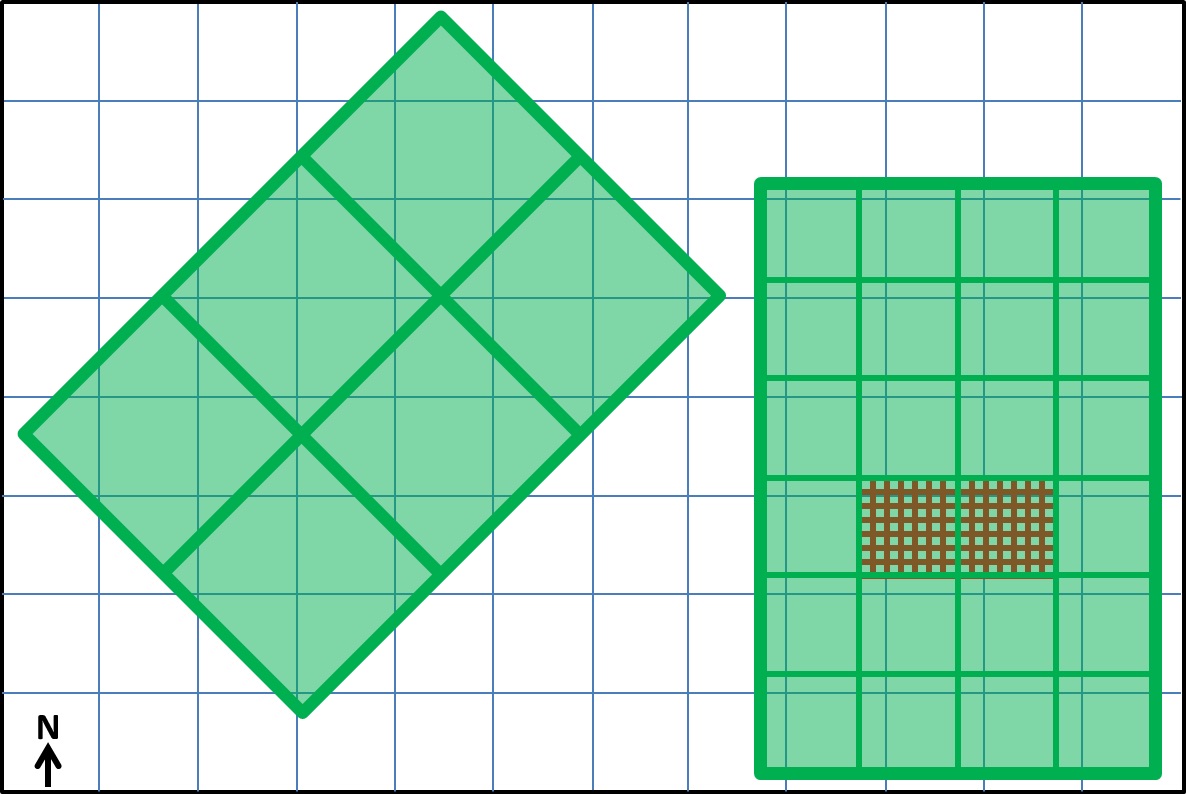 At last, a flow simulation might be rotated compared to the orientation of the geological grid (Figure 3, left). If nothing really constrained the geological grid to be aligned North-South and East-West, while the simulation grid will need to be rotated, it is recommended to build the geological grid directly rotated. In so doing, we are back to the illustration of Figure 1. Such a situation happens, for example, in naturally fractured reservoirs in which the rotation will correspond to the average direction of general stress or to the average direction of the natural fractures.