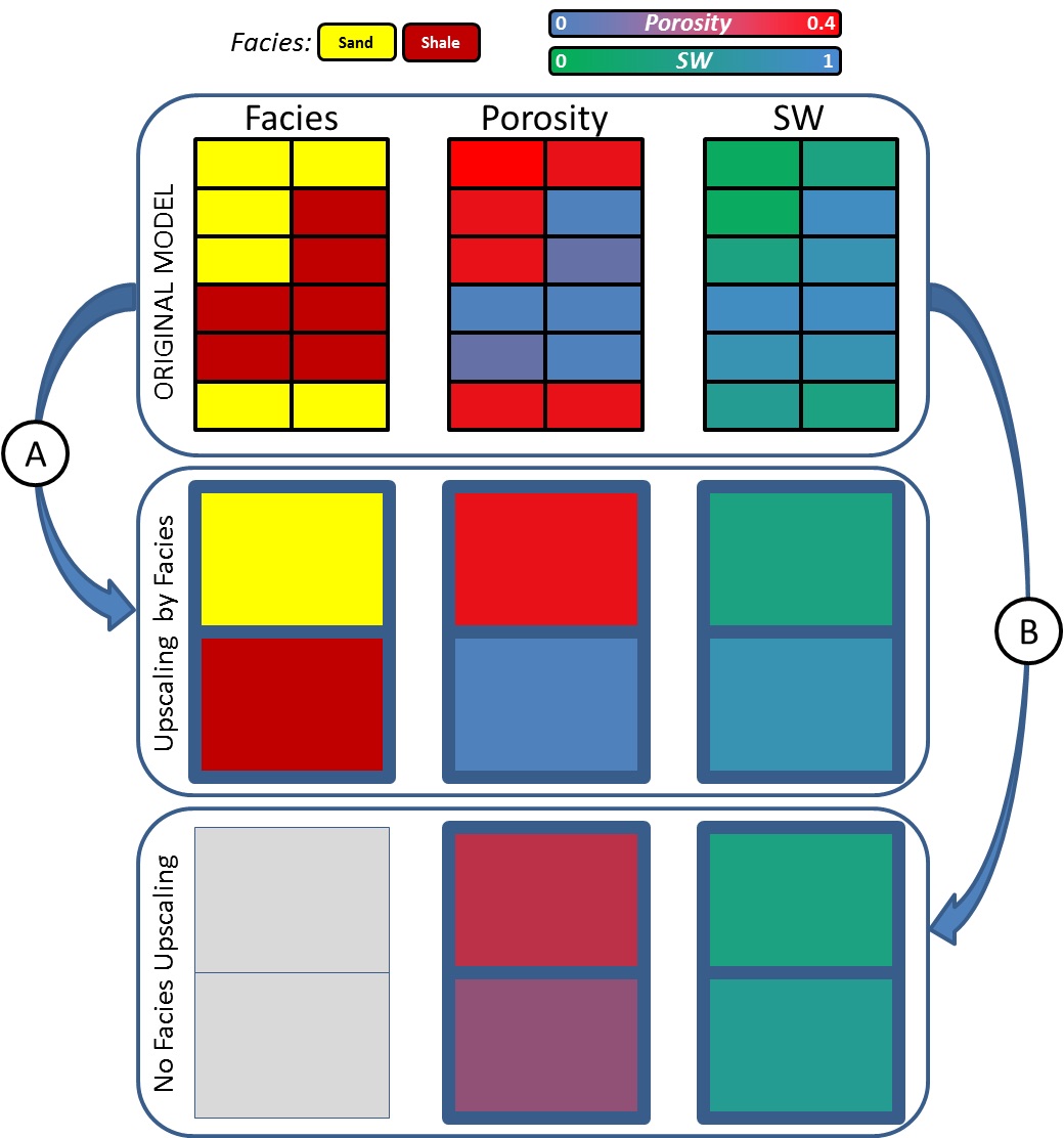 The two methods give some significantly different results in situation, such as the one described here where the original cells belong to two different facies. When filtering by the facies, the resulting upscaled porosity and water saturation are characteristic to what is expected for the respective upscaled facies. The upper upscaled cell is sand and its associated upscaled porosity is around 30%, which is coherent with the values of porosity found on the logs and modeled in the sand facies in the geological grid. The same can be said for the lower upscaled shale cell. On the contrary, with the second method in which facies is ignored, the upscaled values are average of original numbers associated with shale and sand. The upscale cells are not really a sand, nor a shale, anymore. It is an “average facies” of some sort.
