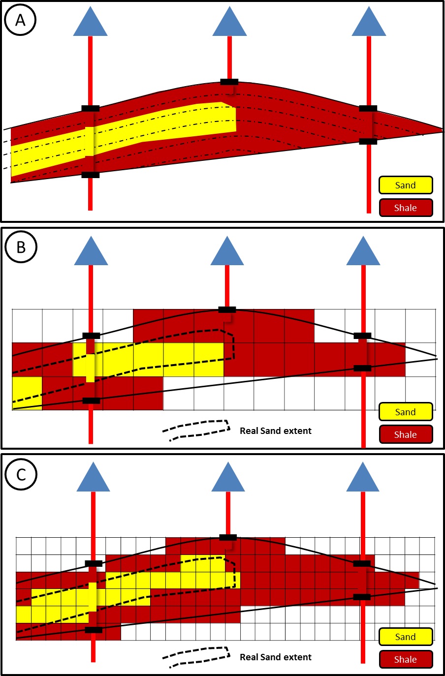 For example, imagine an original geological grid showing a sandbar in the middle of a shale geological unit (Figure 5A). If we create a flow simulation grid with very large cells, the sandbar is split in two parts in the simulation grid (Figure 5B). The simulation grid is too coarse to respect the continuity of the sandbar. This would influence greatly the results of flow simulation. If a flow simulation grid with smaller cells is used (Figure 5C), the continuity is respected. This second simulation grid is more appropriate for this reservoir.