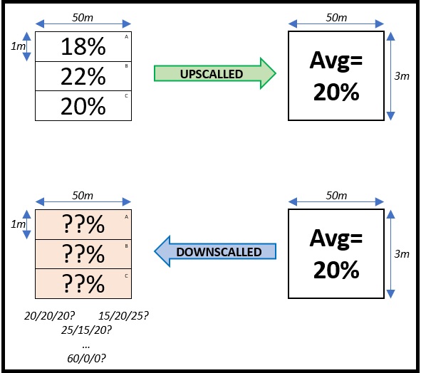 Figure 1 gives a simple example of reverse engineering. We use arithmetic average to compute an average porosity value in the large cell coming from merging three cells A, B and C together. Computing the average porosity out of the known input porosity gives one unique results: (18%+22%+20%)/3=20%. But what about the reverse problem? Knowing that a known average porosity is equal to 20% and knowing it was obtained by arithmetic average, what is the porosity in each of the input cells A, B and C? As illustrated by Figure 1, there is an infinite number of solutions. Porosity could be equal to 20% in all cells, or to (15%/20%/25%) in the cells A/B/C. But it could be the same three values but distributed differently among the three cells. At last, it could even be some extreme set of values like (60%/0%/0%). There is no way to know. The only thing that can be done is to at least restrict the field of possible solutions to what is physically acceptable for the dataset. While the values (60%/0%/0%) give an average of 20% porosity, how often do we find rocks with 60% of porosity? If the cells are all known to represent sands with porosity between 10 and 30 for example, then an additional rule could be imposed: all three values must be between 10 and 30.