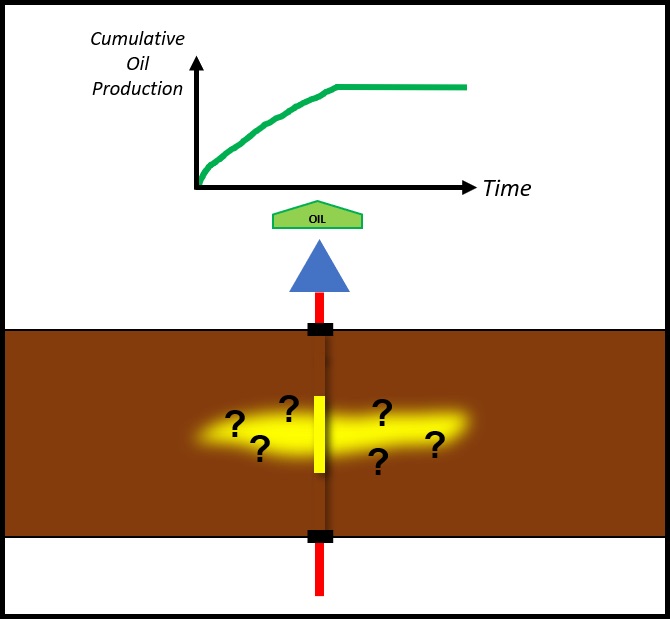 Figure 2 illustrates the challenge of connecting production data to the size and location of a sand geobody. In this example, the evolution of the cumulated oil production through time is known. The production climbed steadily until it plateaued. This well can’t produce anymore through primary production. The well crosses a sand geobody and we know the oil is coming from that geobody. We also assume that only the size of the geobody influences how much oil was produced so far. Of course, in a real situation, such cumulative oil production would be the result of the multiple rock and fluid characteristics. Figure 2 illustrates the challenge of connecting production data to the size and location of a sand geobody. In this example, the evolution of the cumulated oil production through time is known. The production climbed steadily until it plateaued. This well can’t produce anymore through primary production. The well crosses a sand geobody and we know the oil is coming from that geobody. We also assume that only the size of the geobody influences how much oil was produced so far. Of course, in a real situation, such cumulative oil production would be the result of the multiple rock and fluid characteristics.