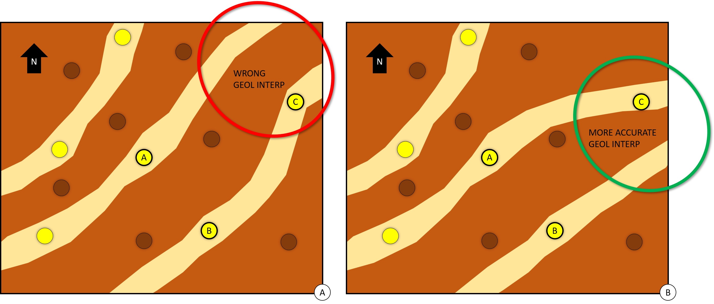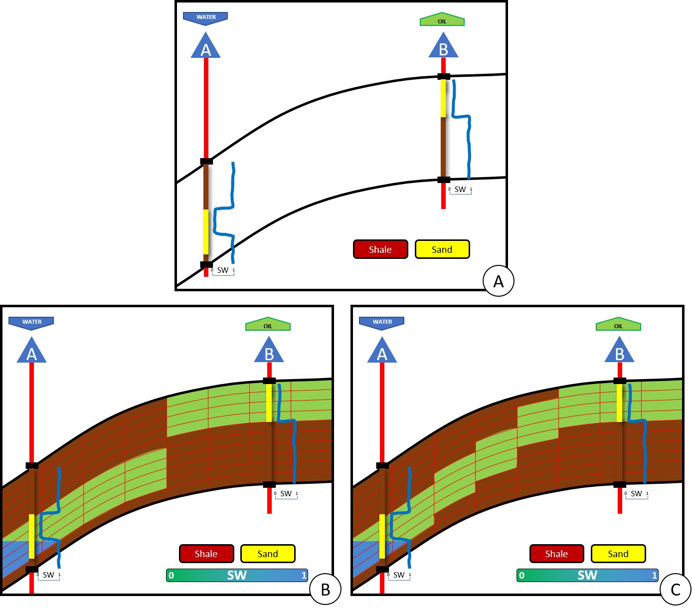 Figure 4 shows another example of extreme unacceptable geomodel which can be discarded. In this example, the reservoir is undergoing waterflooding (Figure 4A). Since water started to be injected on well A, the oil production on well B has increased. Both wells penetrate some sand which are filled with oil (oil and water in well A). The fact the waterflooding is a success implies the two wells penetrate the same sand geobody. From there, a geomodel in which we see two geobodies (Figure 4B) instead of a single geobody crossed by both wells (Figure 4C) is unacceptable and should be improved by the geomodeler.