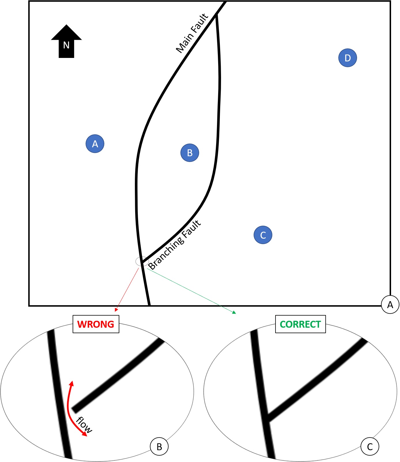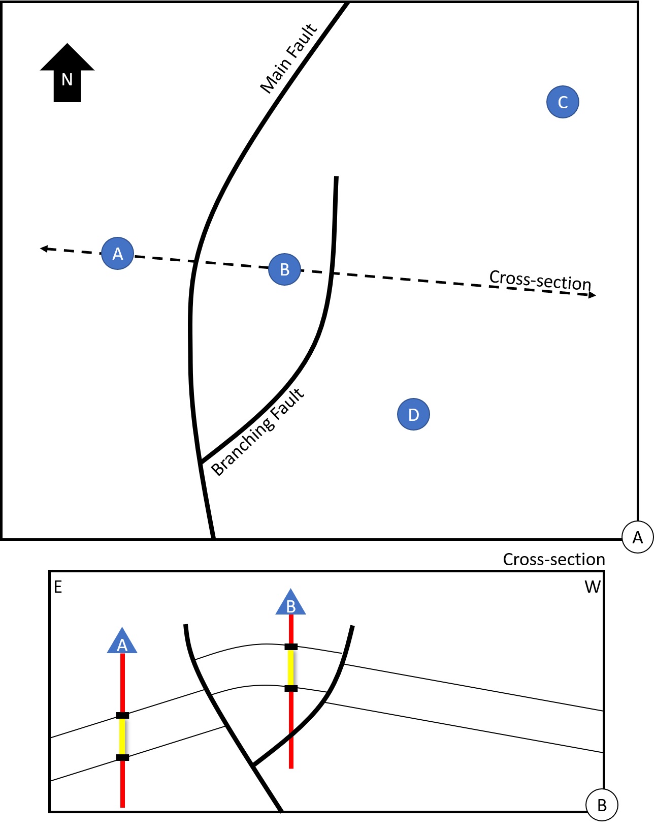 In the schematic reservoir of Figure 5, two faults have been interpreted on seismic but the branching is such that it doesn’t isolate a block per se. Let’s assume that all the wells A, B, C and D have initial pressure data. And let’s assume that wells C and D have similar pressures which are significantly different from the pressures in A and in B respectively. This leads to three conclusions. Firstly, it validates that well A belongs to a block isolated from the other wells by the Main Fault. Secondly, it shows that the current extension of the Branching Fault is problematic. If well B was part of the same block than wells C and D, then well B would have a initial pressure similar to the one in the two other wells. But it’s not the case. The most logical, geological solution is to extend the Branching Fault North until it completely isolates the well B into a small block delimited by the Main Fault and the Branching Fault (Figure 6A). Thirdly, the faults are sealed, meaning the simulation engineer will need to set their transmissibility to zero.